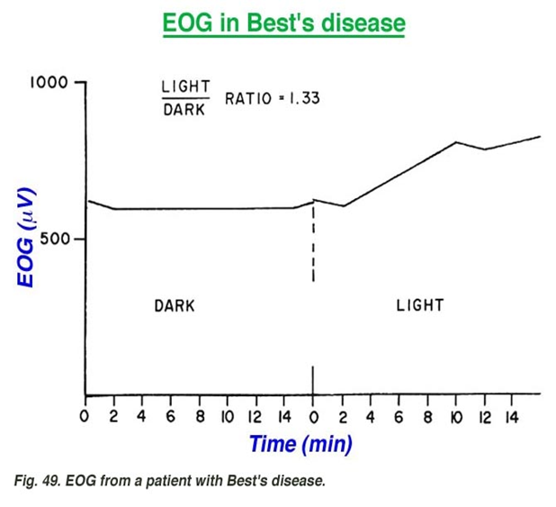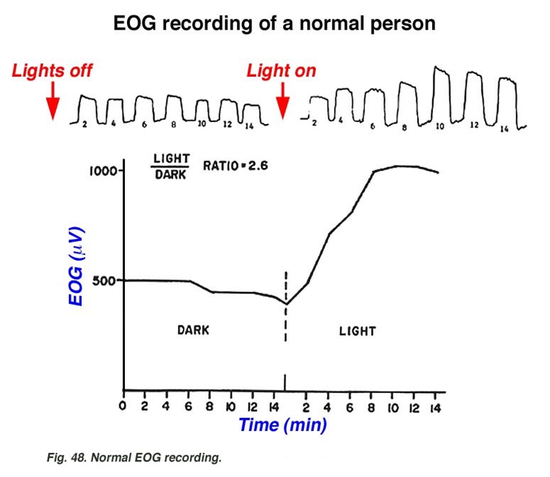 •Although the origin of the EOG is the pigment epithelium of the retina, the light rise of the potential requires both a normal pigment epithelium and normal mid-retinal function