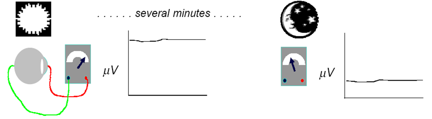 •The potential produces a dipole field with the cornea approximately 5 millivolts positive compared to the back of the eye, in a normally illuminated room
