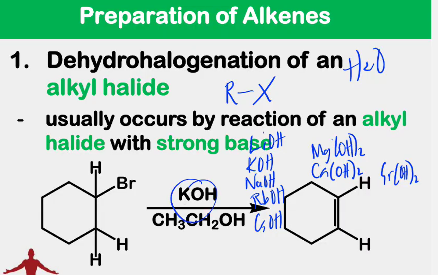 _________________ of an alkyl halide - usually occurs by reaction of an alkyl halide with strong base