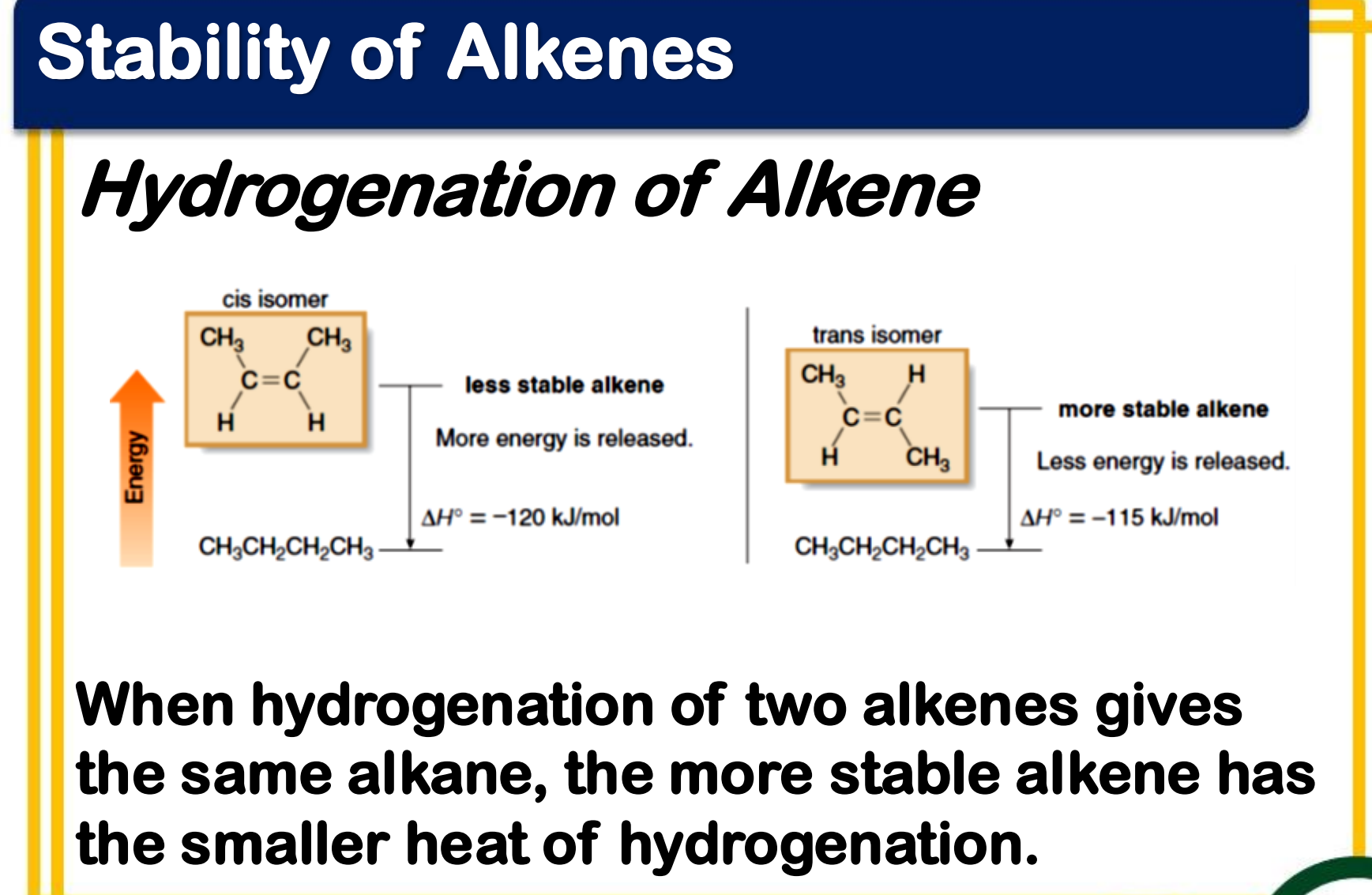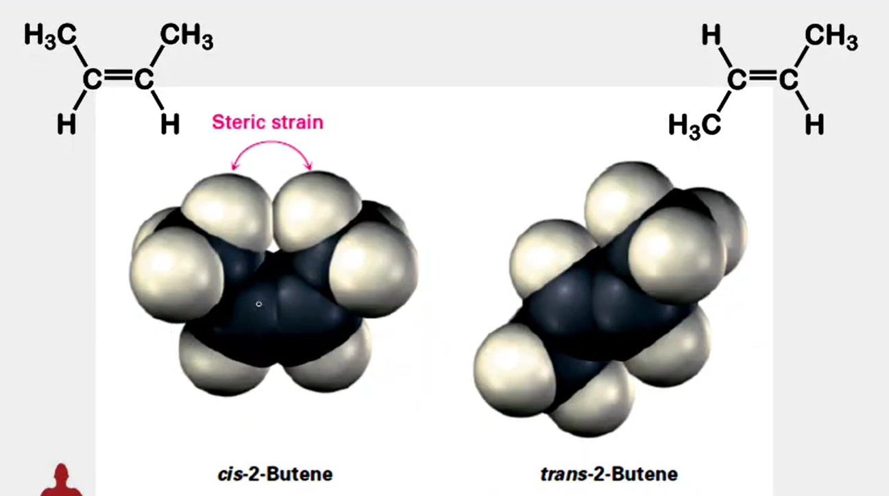 Stereochemistry - trans alkenes are generally more stable than cis alkenes because the groups bonded to the double bond carbons are farther apart, reducing steric interactions