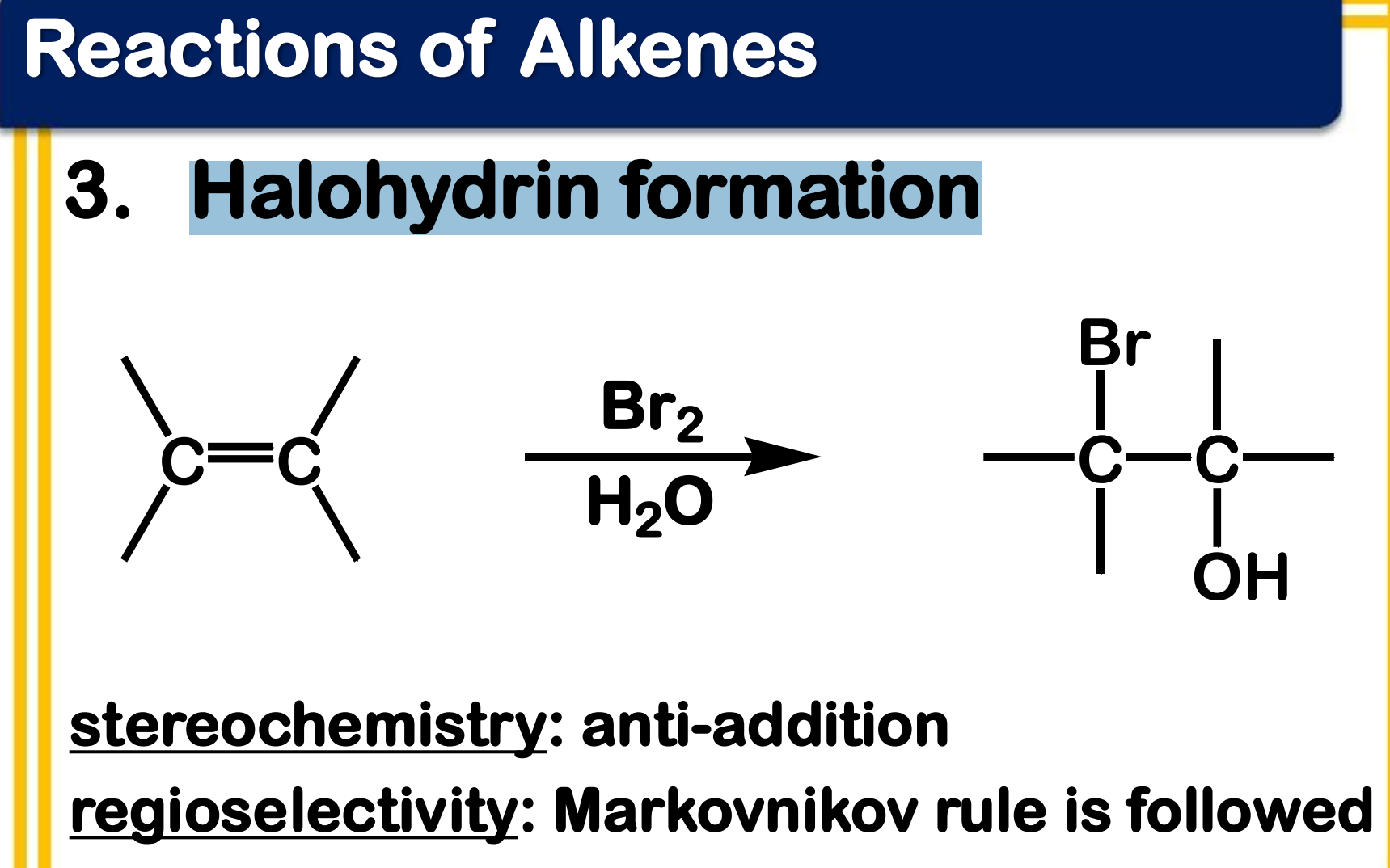 stereochemistry: anti-addition (two parts of the reagent are added from opposite sides of the double bond)