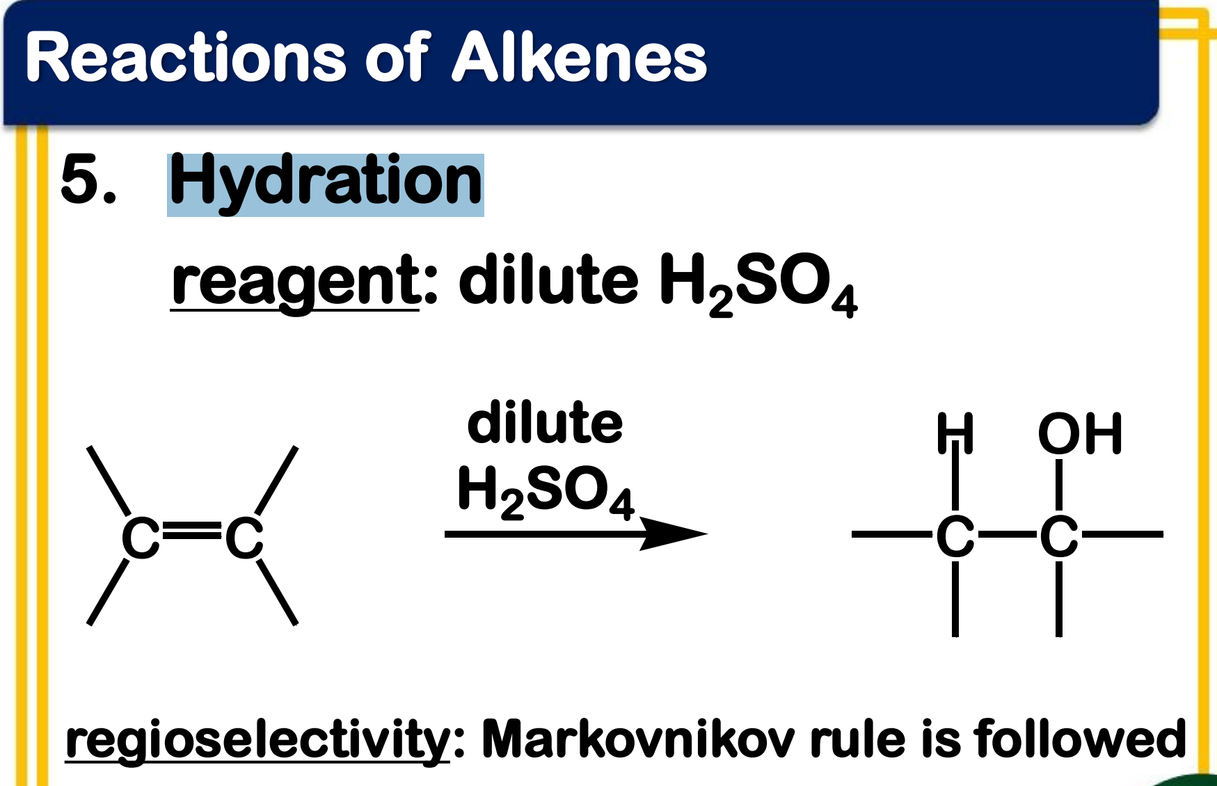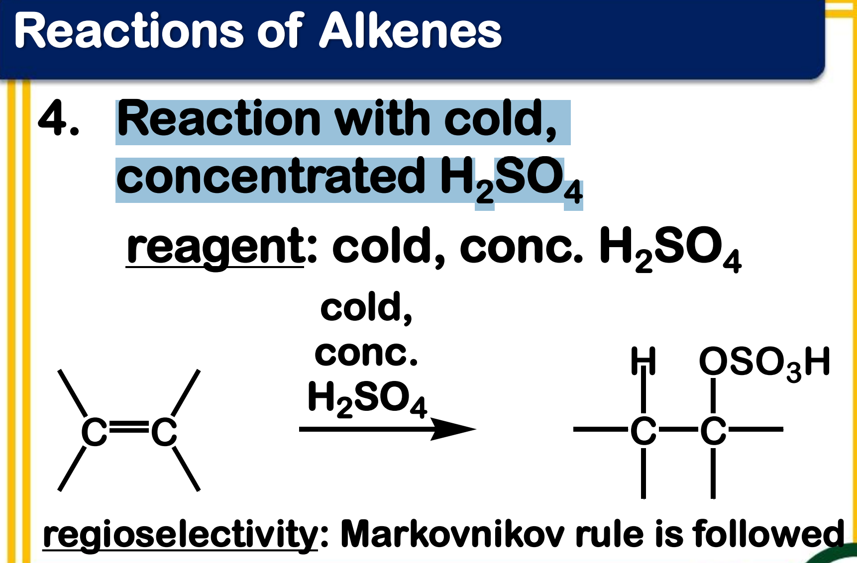 Electrophilic addition; Reaction with cold, concentrated H2SO4