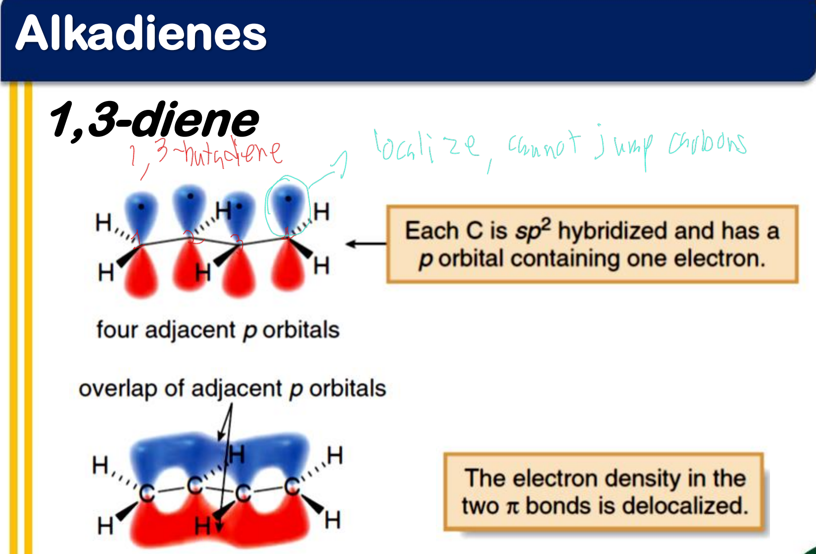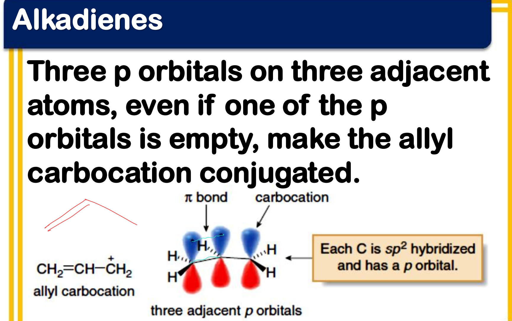 - the p orbitals of the double bond carbons each contain an electron, while the p orbital of the carbocation is empty