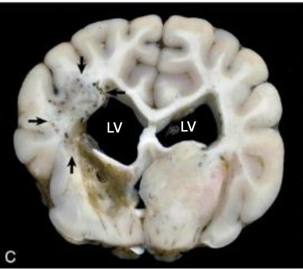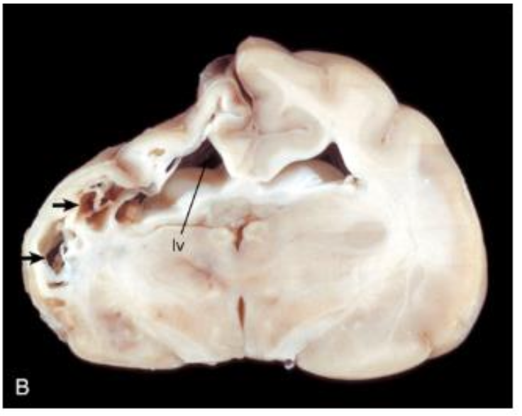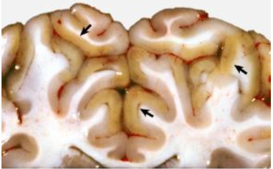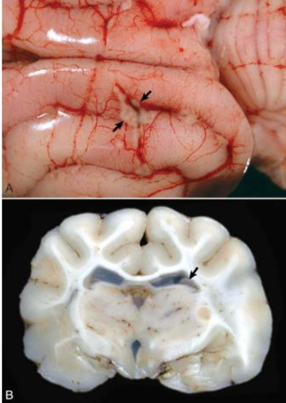 Necrotizing meningoencephalitis (NME): pugs, chihuahuas, maltese; swelling of cerebral gyri with loss of distinction between white and gray matter → cortical necrosis, cavitation hydrcephalus