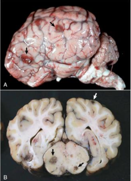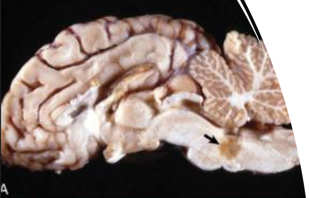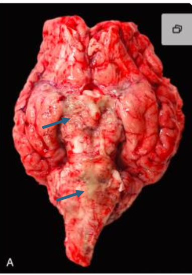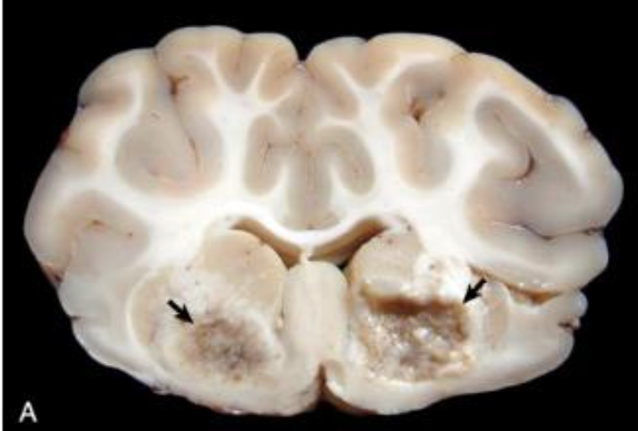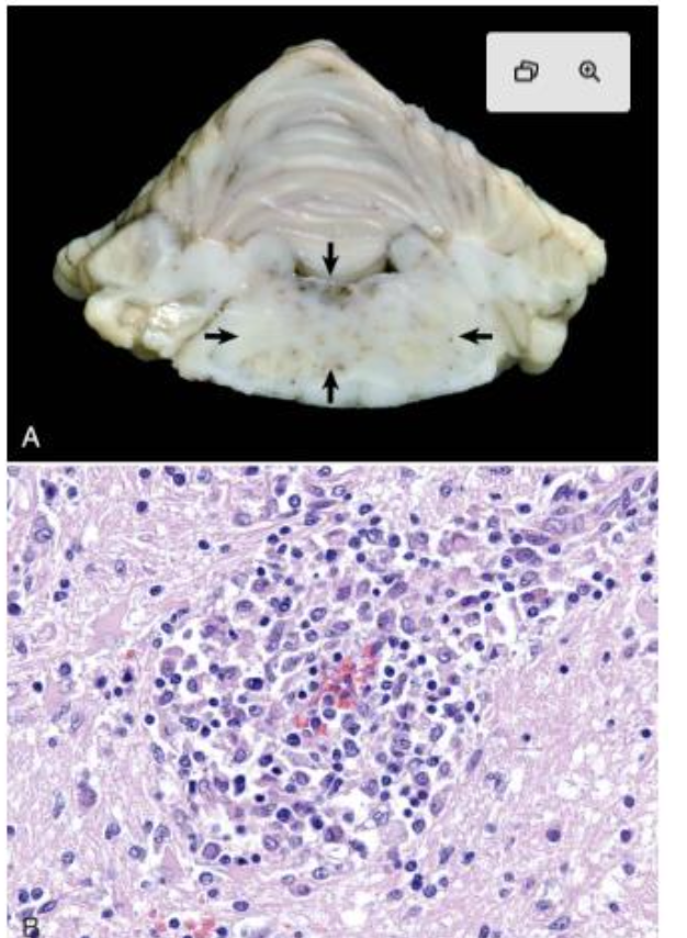 neonatal puppies infected with virus → multifocal necrotizing encephalitis (brainstem, cerebellum)