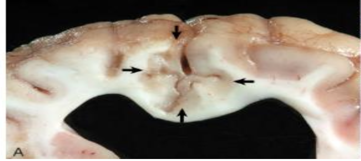 (“overeating disease” in lambs and kids) enterotoxin → vascular injury → BBB breakdown → bilaterally symmetric foci of malacia and cavitation in white matter (“focal symmetric encephalomalacia”)
