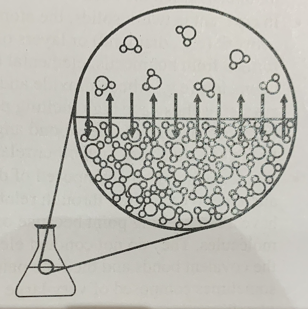 In this diagram showing a sample of pure water in a sealed flask at room temperature, the arrows indicate that molecules undergo: