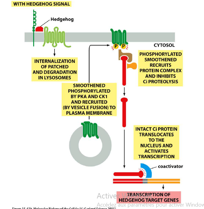 inhibition de Smoothened par Patched → empeche une accumulation de Smoothened au niveau de la membrane, qui est initialement sur la membrane de vesicules intracellulaires