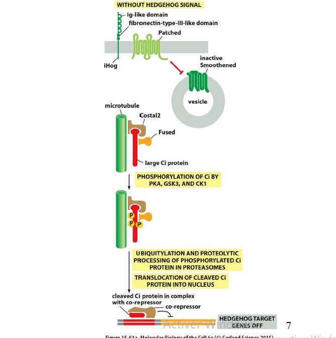 Ci est phosphoryle par la PKA → se fait clive par la voie proteasome generant Ci75, qui agit comme represseur transcriptionnel