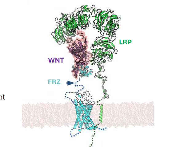 Lors de la signalisation, Frizzled se lie au ligand Wnt et a LRP, une coproteine transmembranaire ancre par 1 helice alpha transmembranaire