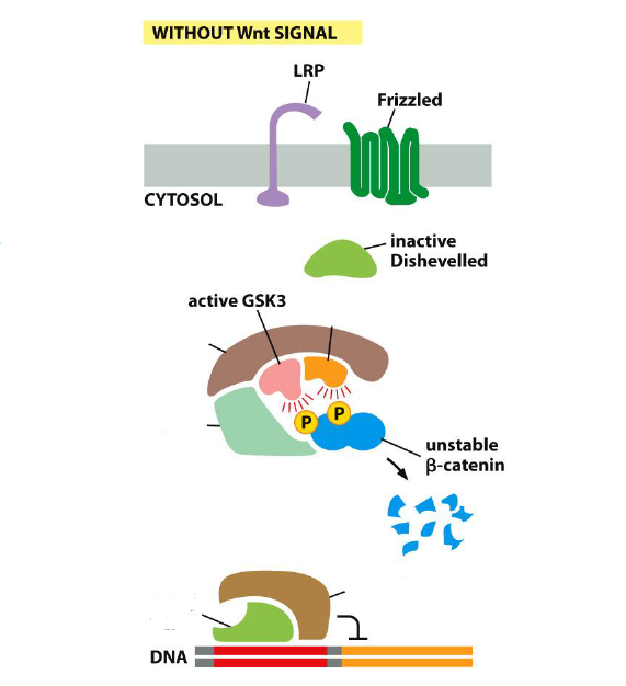 en absence du ligand Wnt, beta catenine forme un compelxe avec plusieurs proteines cytosoliques