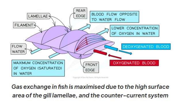The blood in the capillary system flows in the opposite direction to the flow of water as it passes over the gills.