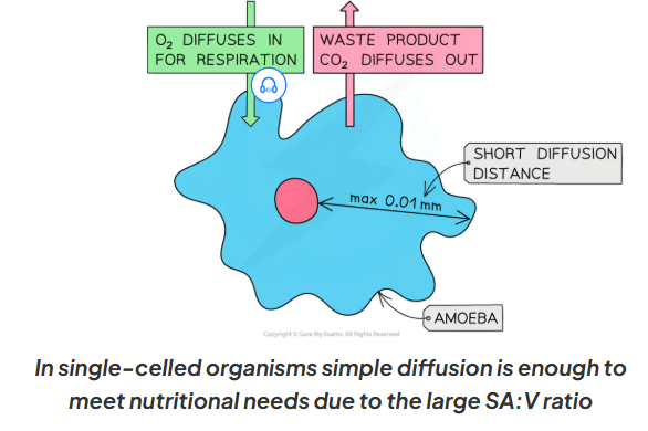 Simple diffusion at the cell surface is sufficient to meet the needs of the cell, because of its high SA:V ratio.