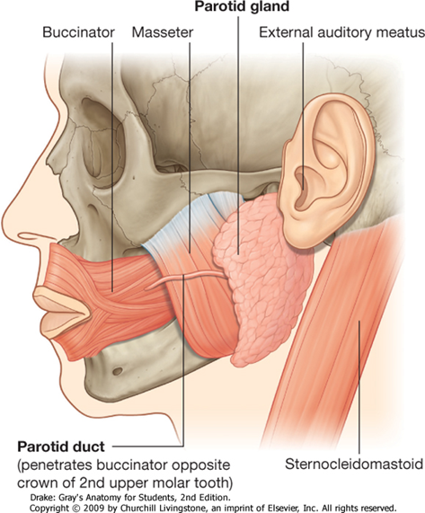 •Parotid duct – pierces buccinator to enter the oral cavity near the upper 2nd molar tooth