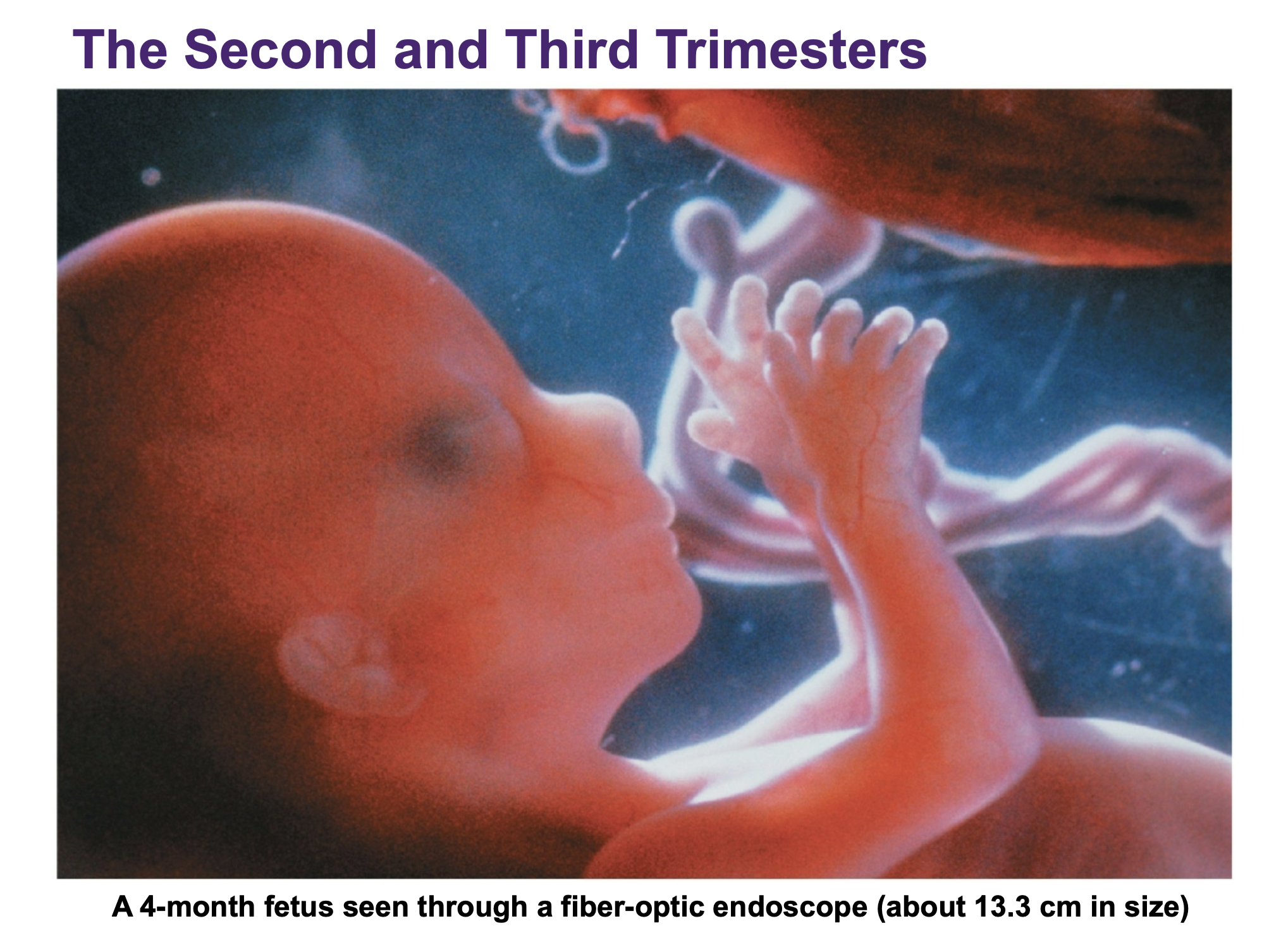 fertilization of an egg cell; implantation of zygote in the uterus; multiple cell divisions to initiate growth and directionality of embryo; development of embryo into the fetus; maturation of organ systems in the fetal body; to the point of birth