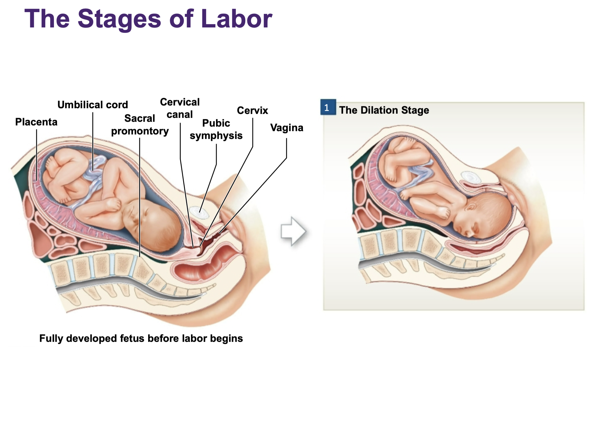 The cervix dilates, the fetus is pushed by muscular contractions into the cervical canal, and the amnion ruptures – water breaking