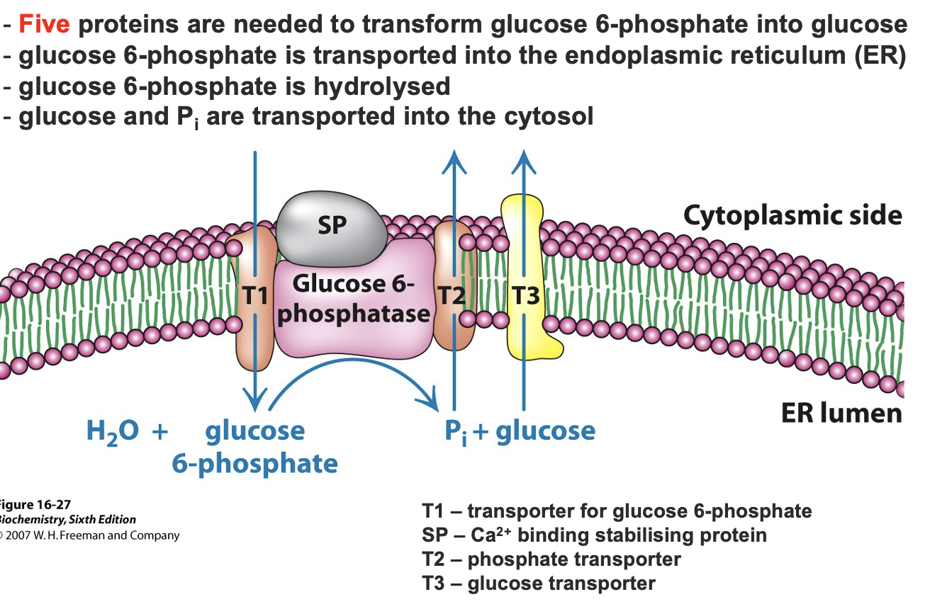 glucose 6 phate → gluose via Glucose-6-phosphatase removing the phosphate group in liver and kidneys in the ER