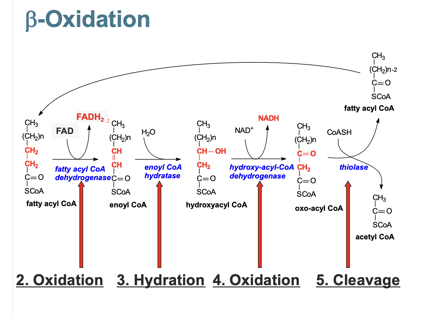 ketone group attacked by coA splitting into fatty acyl coA and acetyl CoA
