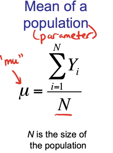 Population Mean (μ) is the true average of the entire population of size 'N'. The formula is
