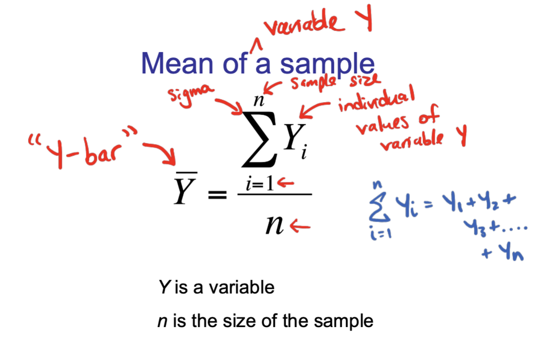 Sample Mean (Y) is the average of a sample of size 'n' taken from a larger population. The formula is