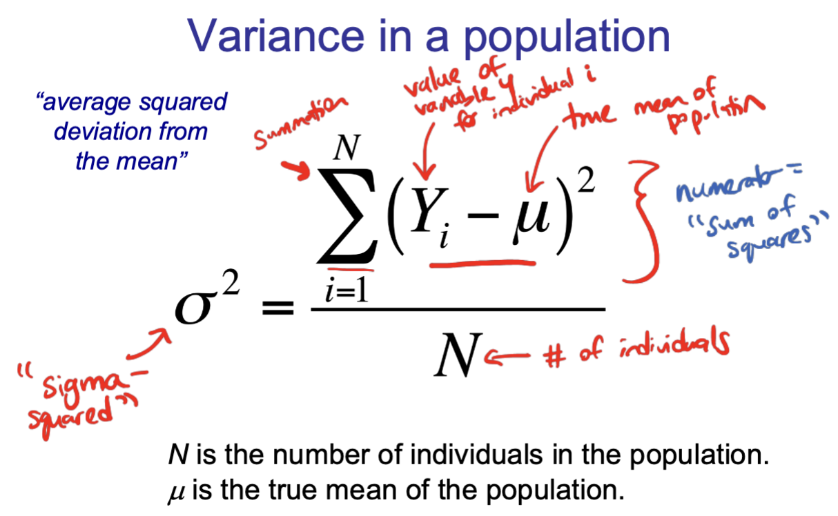 Population Variance (σ2) divides the sum of squared deviations by the total population size, N.