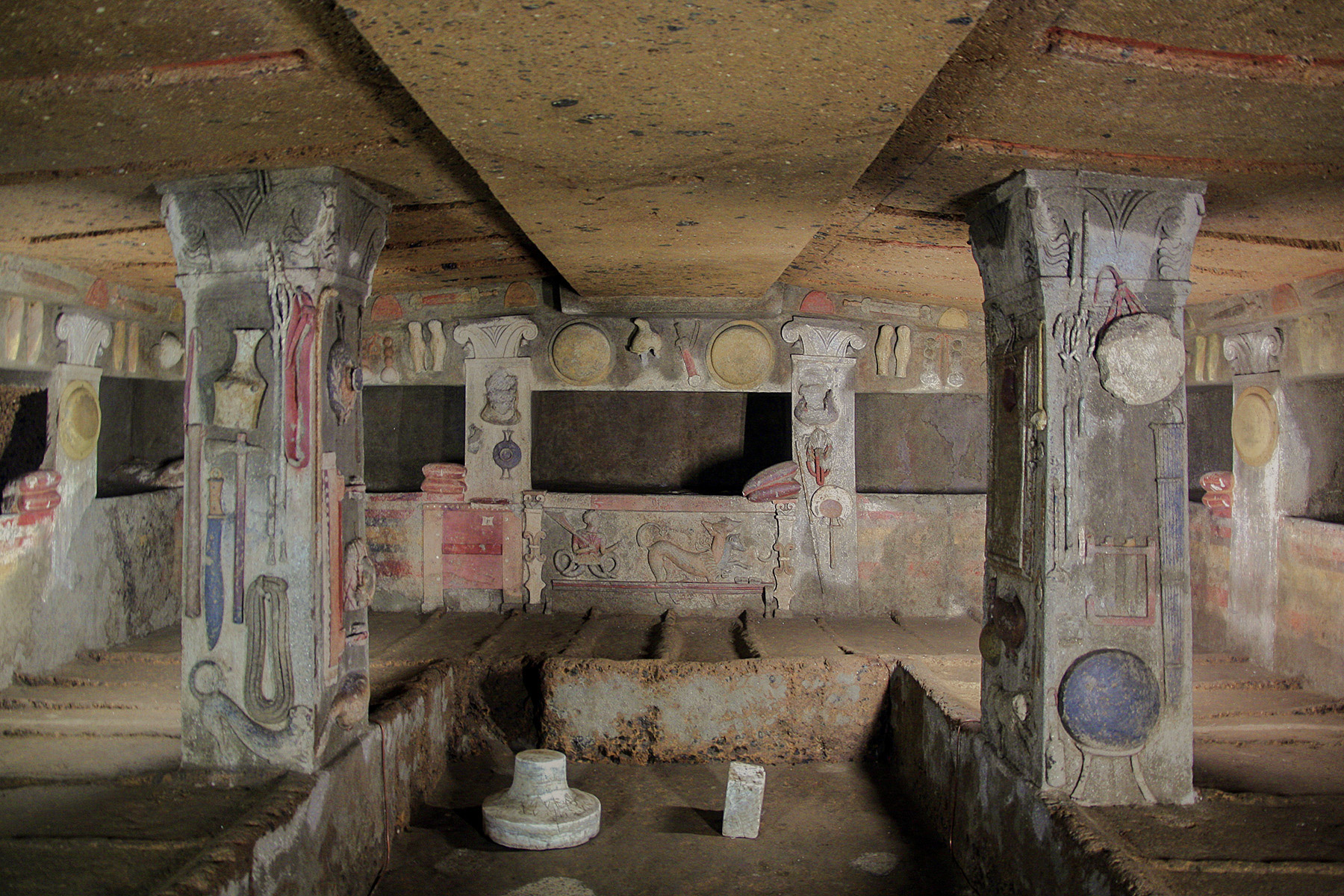 places for sarcophagi, ash urns, and places for meals were placed along the wall