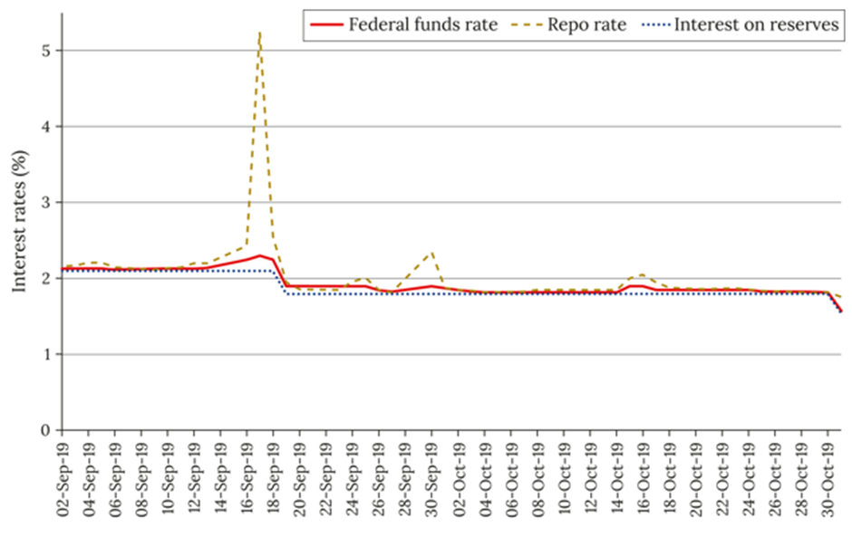 repurchase agreement - banks borrow by selling a bond in the repo and promising to buy it back the next day (or 14 days later) at a slightly higher price