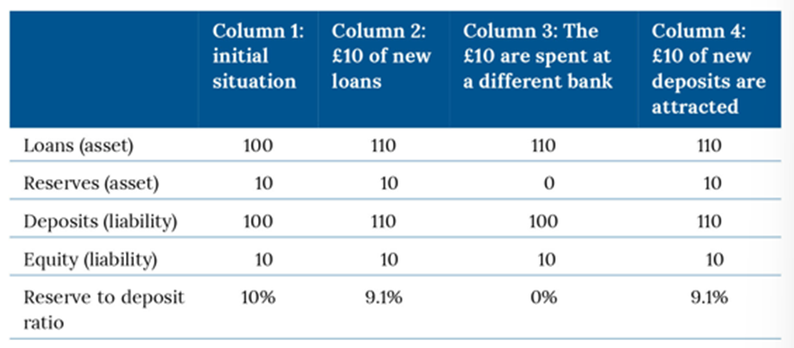 Column 2: Bank A makes a £10 loan. Loan on the asset side and deposit on the liability side each increase by 10.