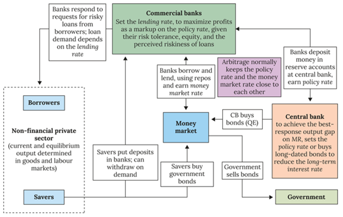 increase in policy rate by CB causes increase in money market due to arbitrage → increases lending rate by commercial banks
