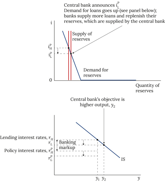 CB implements a cut in the policy rate (i.e. raising output target from y1 to y2)