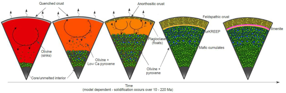 late stage KREEP plase and Fe-rich minerals (ilmenite) form and trapped between mantle and crust