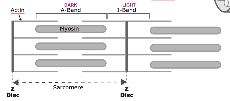 Describe the A-band, I-band, Z-disk, Sarcomere