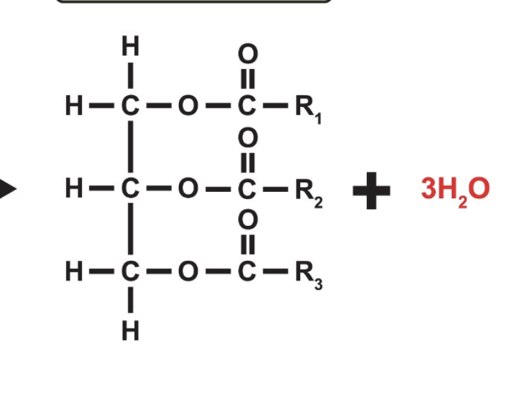 A condensation reaction between glycerol and fatty acids which form an ester bond- meaning they can be hydrolyzed back into glycerol and fatty acids.