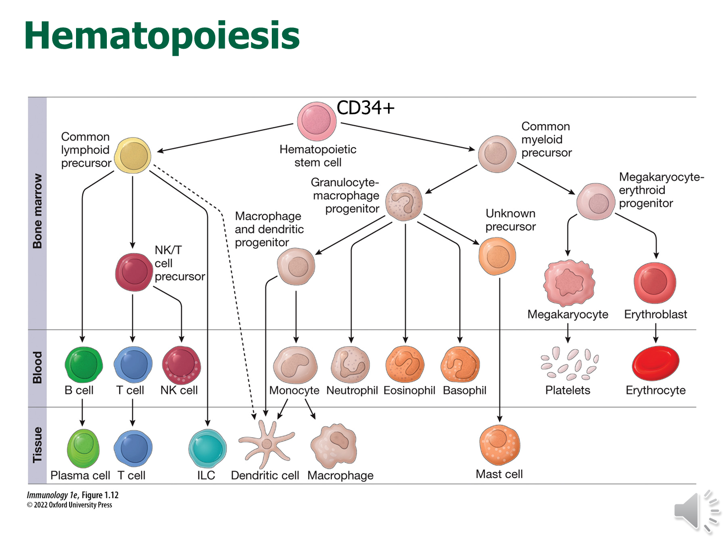 All immune cells and cytokines originate from a hematopoietic stem cell identifiable by the expression of CD34+