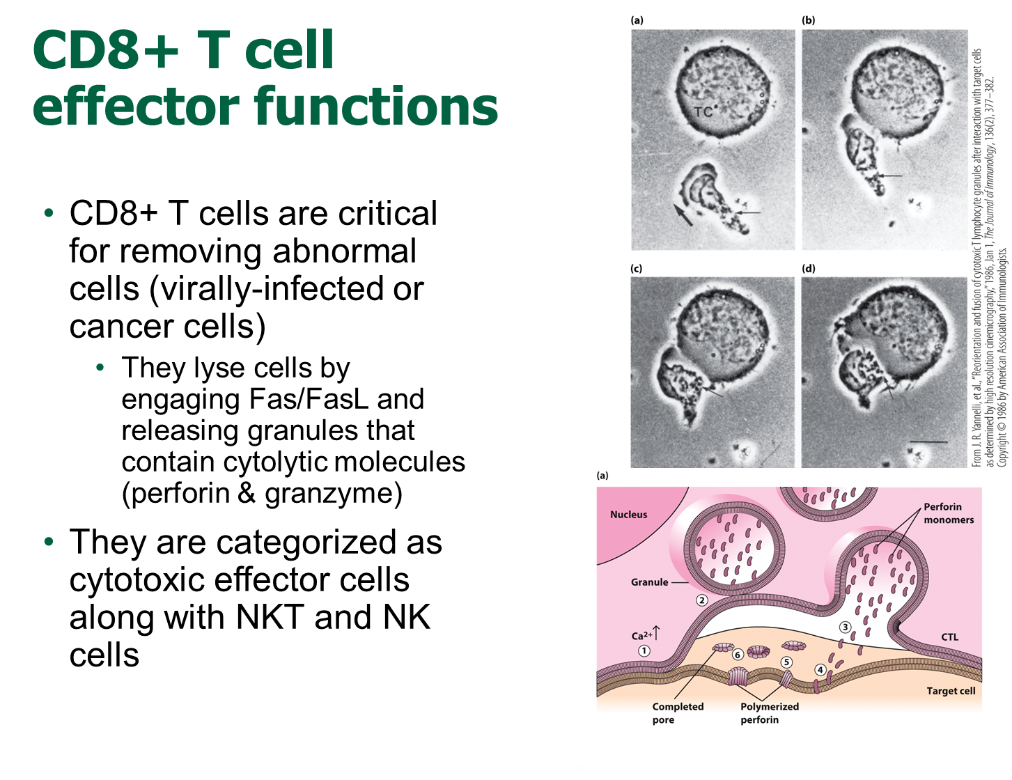 → lyse cells via engaging Fas/FasL and releasing granules like perforin (forms pores in the cell) and granzyme (induces cell death) to kill the cells
