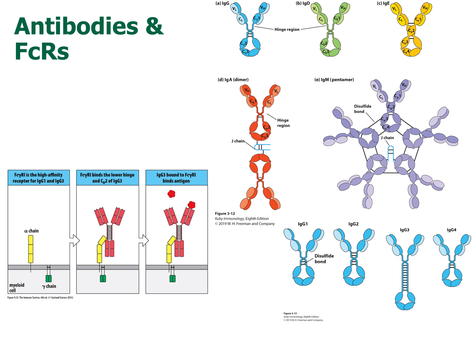 2) There are five kinds of antibodies that differ in their Fc region: IgG, IgD, IgE, IgA, IgM