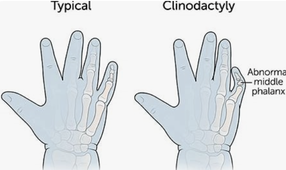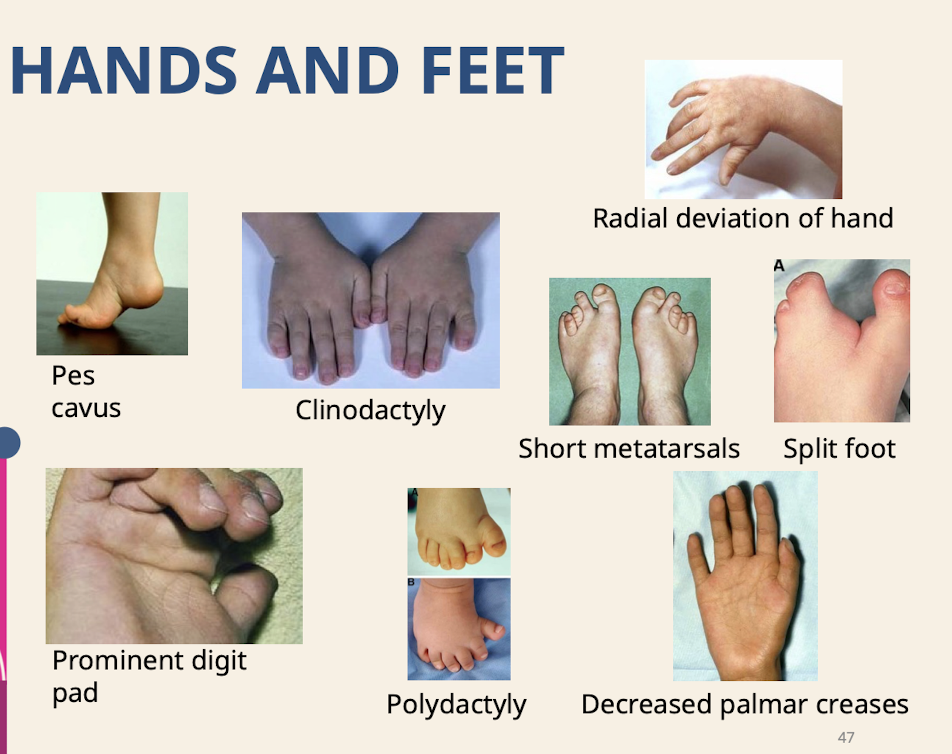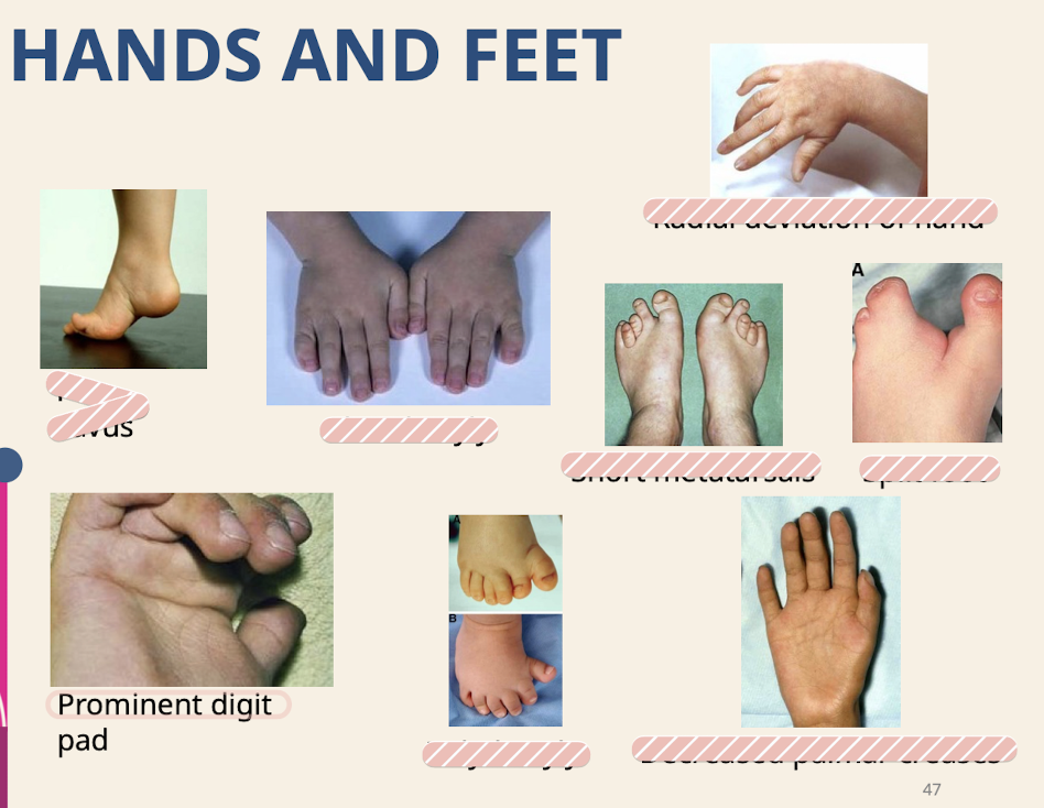 Pes cavus (High-arched foot.) Clinodactyly; Radial deviation of hand; Prominent digit pad; Short metatarsals; Split foot; Decreased palmar creases; Polydactyly