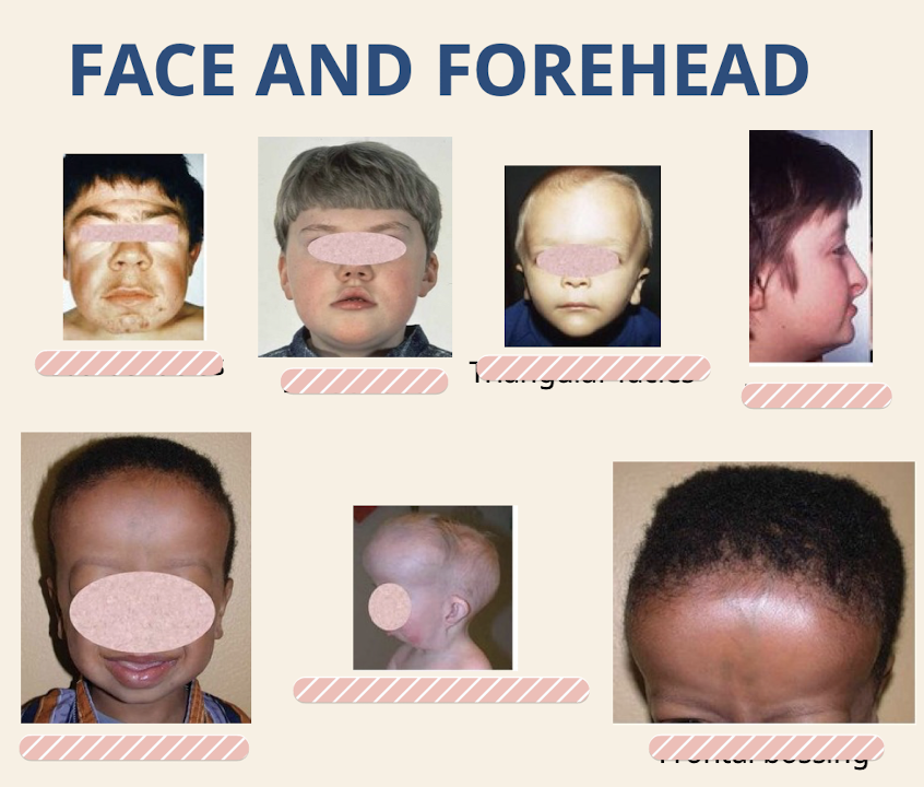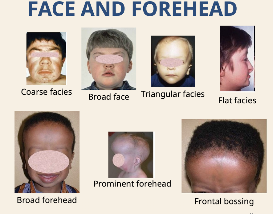 Coarse facies (absence of fine and sharp lines; due to thickened skin) Broad face; Triangular facies (brain growing faster than rest of face); Flat facies; Broad forehead; Prominent forehead; Frontal bossing (lateral frontal bone prominences but spares the center)