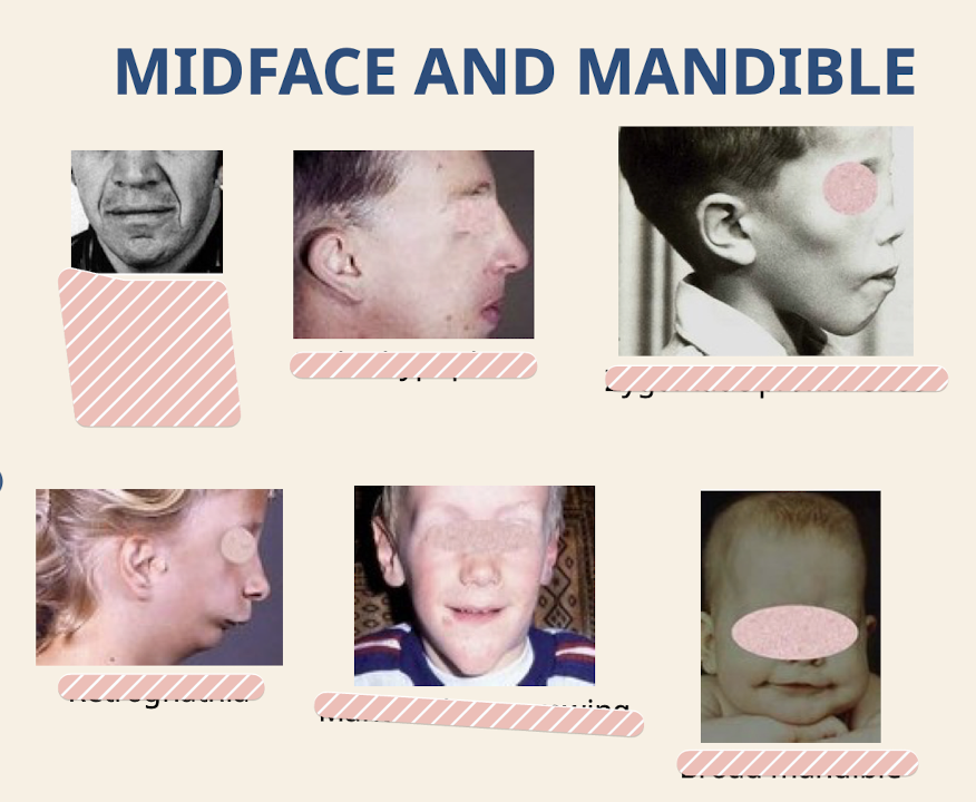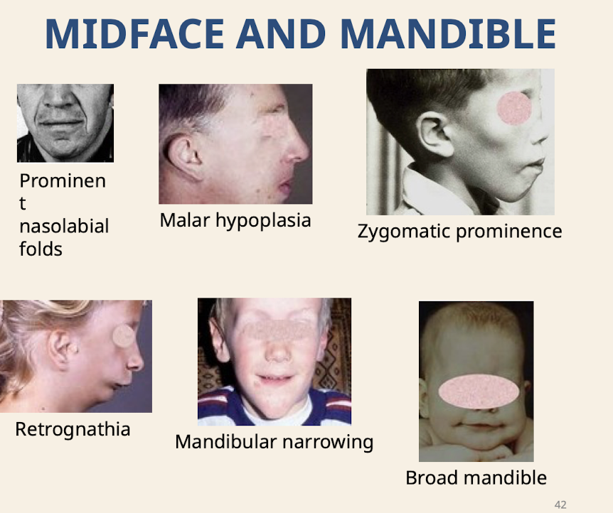 Prominent nasolabial folds; Malar hypoplasia (underdevelopment of malar process of maxilla); Zygomatic prominence; Retrognathia; Mandibular narrowing; Broad mandible