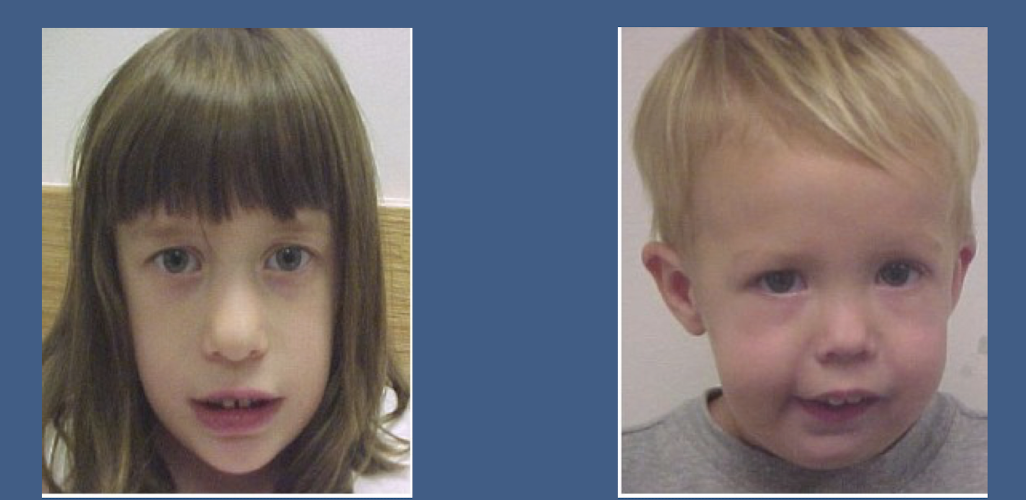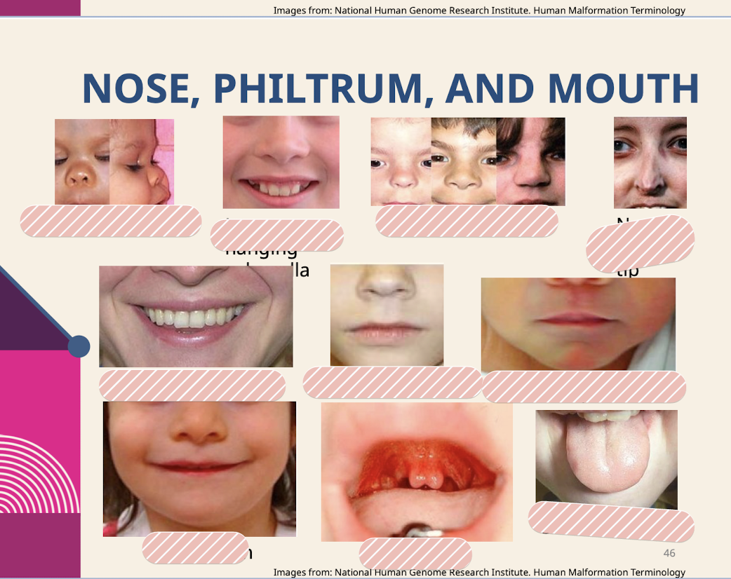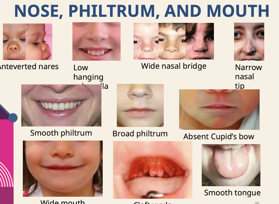 Anteverted nares; Low hanging columella; Wide nasal bridge; Narrow nasal tip; Smooth philtrum; Broad philtrum; Absent Cupid’s bow; Smooth tongue