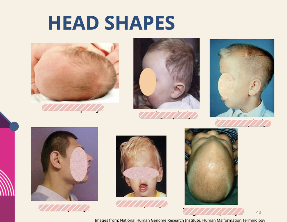 Dolichocephaly (increased anterioro posterior length compared to width); Brachycephaly (short head) ; Macrocephaly; Microcephaly; Turricephaly (tall head) trigonocephaly (wedge shaped/triangle shaped head)