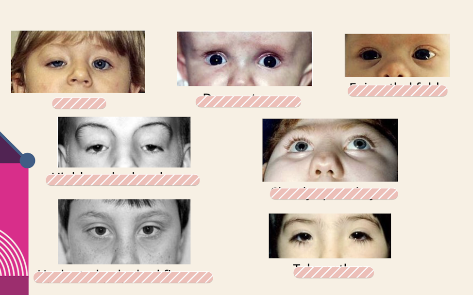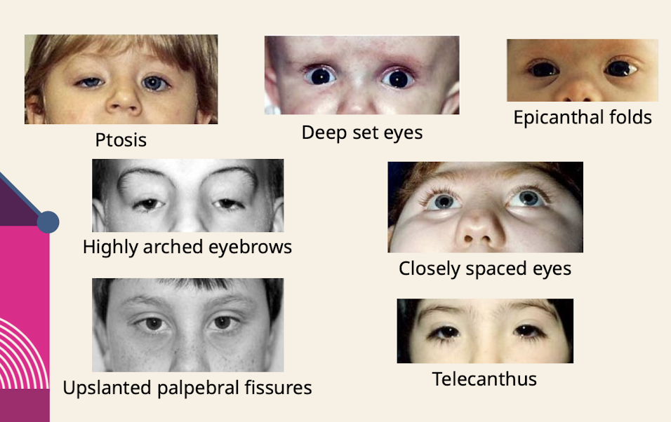 Ptosis; Deep set eyes; Epicanthal folds( skin folds of the upper eyelid that cover the inner corner (medial canthus) of the eye) Highly arched eyebrows; Closely spaced eyes; Upslanted palpebral fissures; Telecanthus (increased distance between the inner corners (medial canthi) of the eyes)