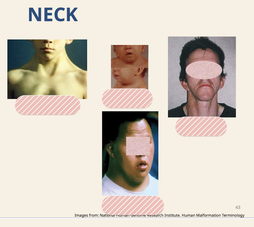 Webbed neck (seen with large nuchal translucency, lymph fluid builds up behind the neck so skin builds up); Short neck; Long neck; Broad neck