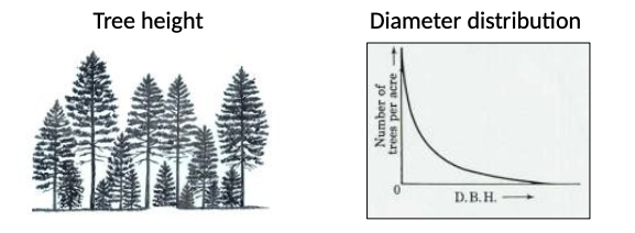 the horizontal and vertical distribution of components of a forest stand, including the height, diameter, crown layers, and stems of trees/shrubs/herbaceous understory/snags/down wood debris.