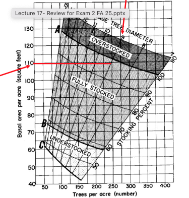 Say we have a BA/ac estimate of 90 and a mean DBH of 8 inches, is it Fully, Over, or Understocked? And what stocking level would we have?