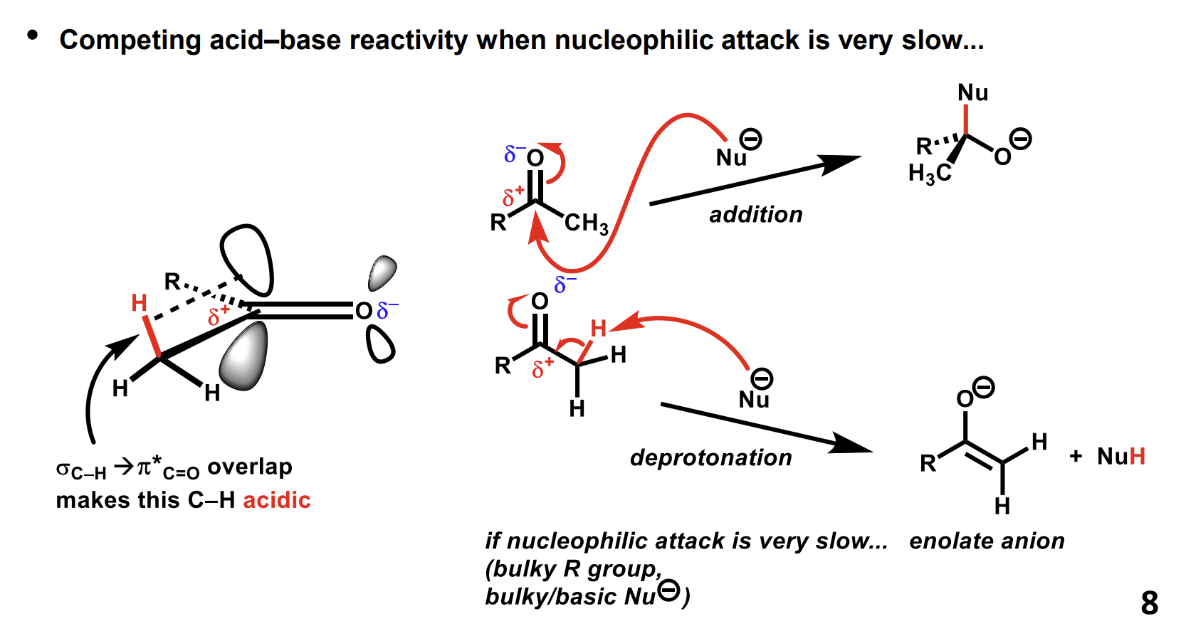 The H on the Me is acidic and can result in a nucleophile acting as a base, forming an enolate product.