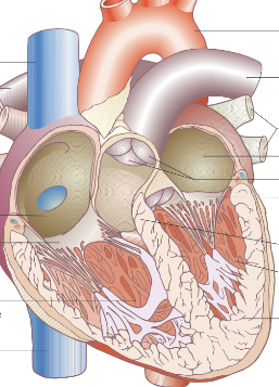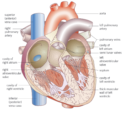 Muscular pump located in the chest, made of cardiac muscle. Made of atria which are thin walled and elastic, and the ventricles which are much thicker as they have to contract strongly.