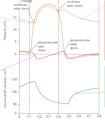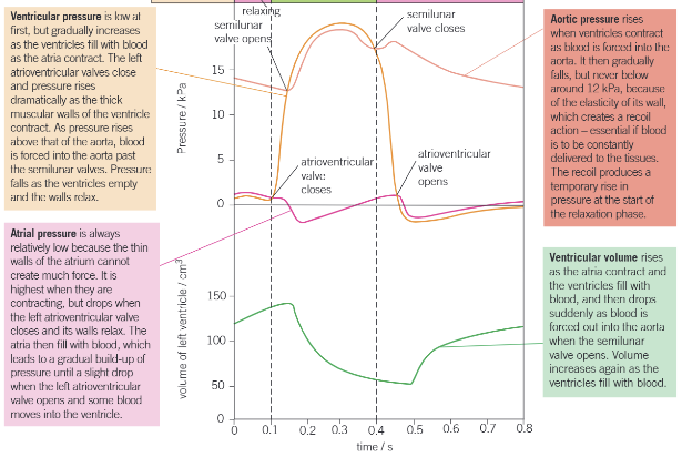 After a short delay to allow ventricles to fill with blood, their walls contract, blood pressure increases, forcing atrioventricular valves shut preventing backflow of blood. Valve tendons prevent valves turning inside out, and papillary muscles contract to keep valves taut. Blood pressure is higher in the ventricles than aorta/ pulmonary artery, so semi-lunar valves open and blood is forced into the vessels. Thick muscular walls create the high pressure.
