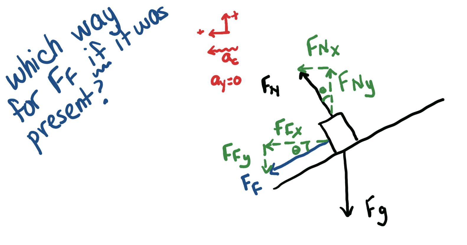 notice that friction acts along the ramp because its the force between the object and the surface, gravity acts down ALWAYS, and Fn is perpendicular to the surface