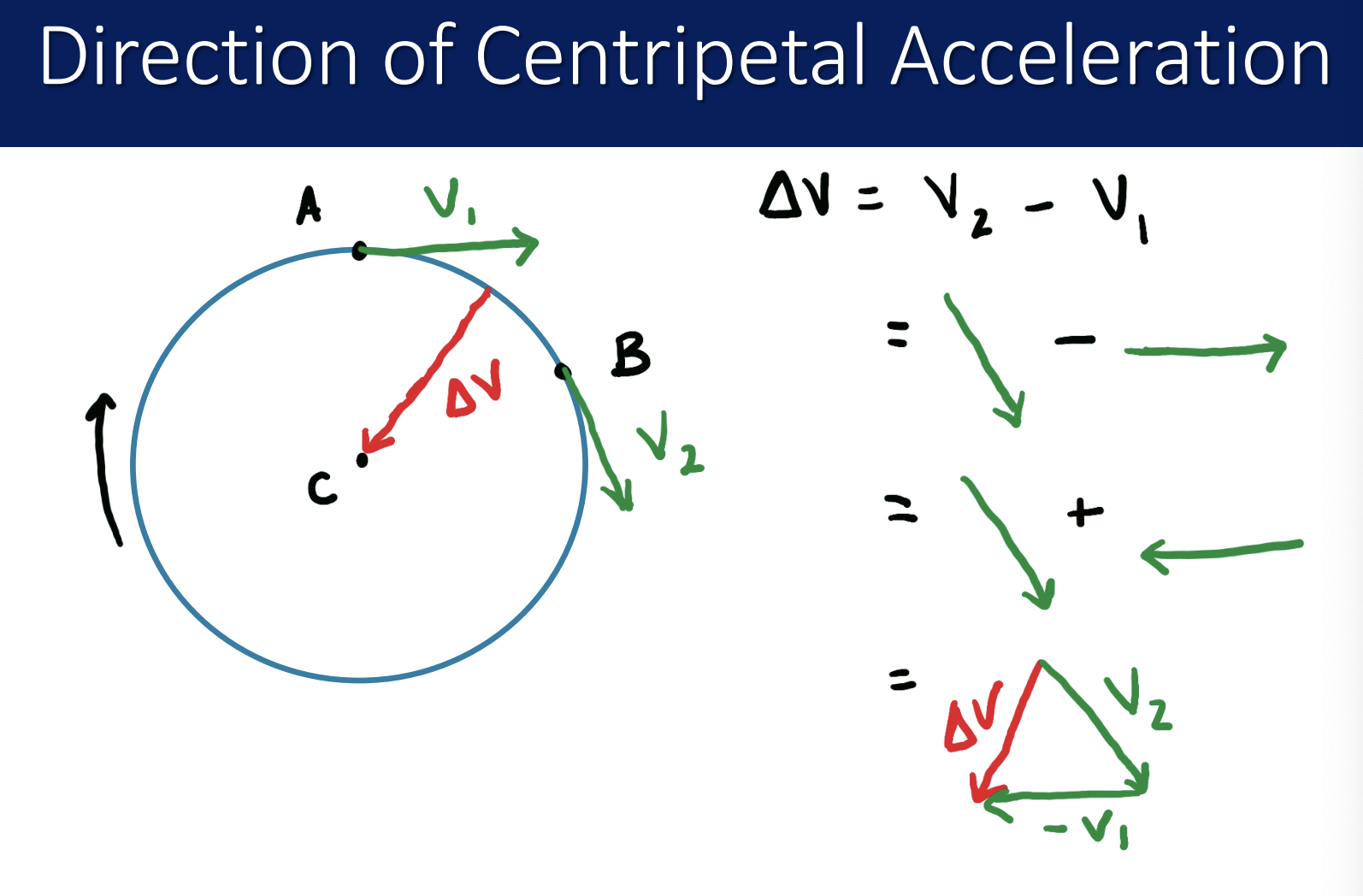 show how the direction of centripetal acceleration is in the same direction as ∆v